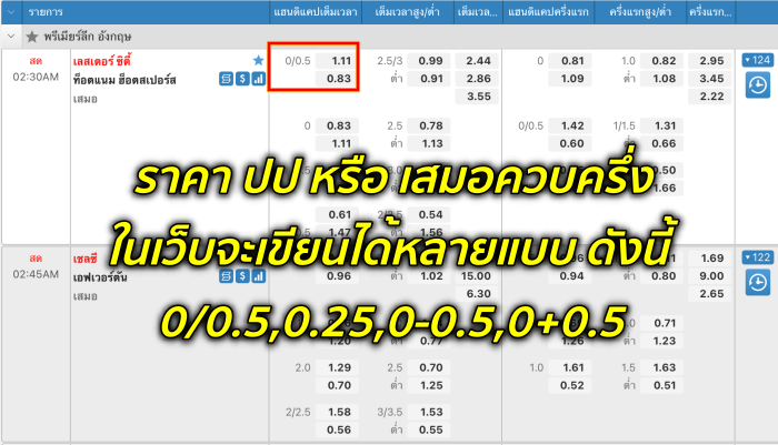 0-0.5,0+0.5,0.25,0/0.5 ในราคาเหล่านี้ล้วนแล้วแต่เป็นราคา เสมอควบครึ่ง ทั้งนั้น เห็นเขียนต่างกัน แต่ความหมายเหมือนกัน เวลาเจอแบบนี้ก็ให้เข้าใจว่ามันคือราคา เสมอควบครึ่ง ทุกราคา