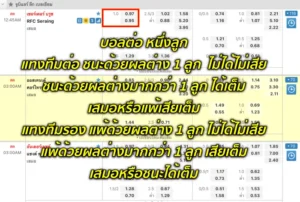 • วางเดิมพันทีมต่อ ชนะ ด้วยผลต่าง 1 ลูก เจ๊ากันไป ชนะ ด้วยผลต่างมากกว่า 1 ลูก ได้เงินเต็ม เสมอหรือว่าแพ้ก็เสียเงิน